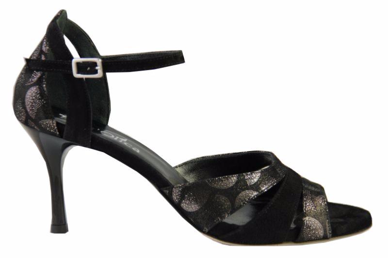 Chaussures de tango argentin de la marque Tang'Olica fabriquées de manière artisanale en Italie. Chaussures en daim fantaisie noir avec motifs argentés et daim noir, talon laqué noir de 7 cm. Chaussures très confortables, très stables et très élégantes. Chaussures à mémoire de forme.